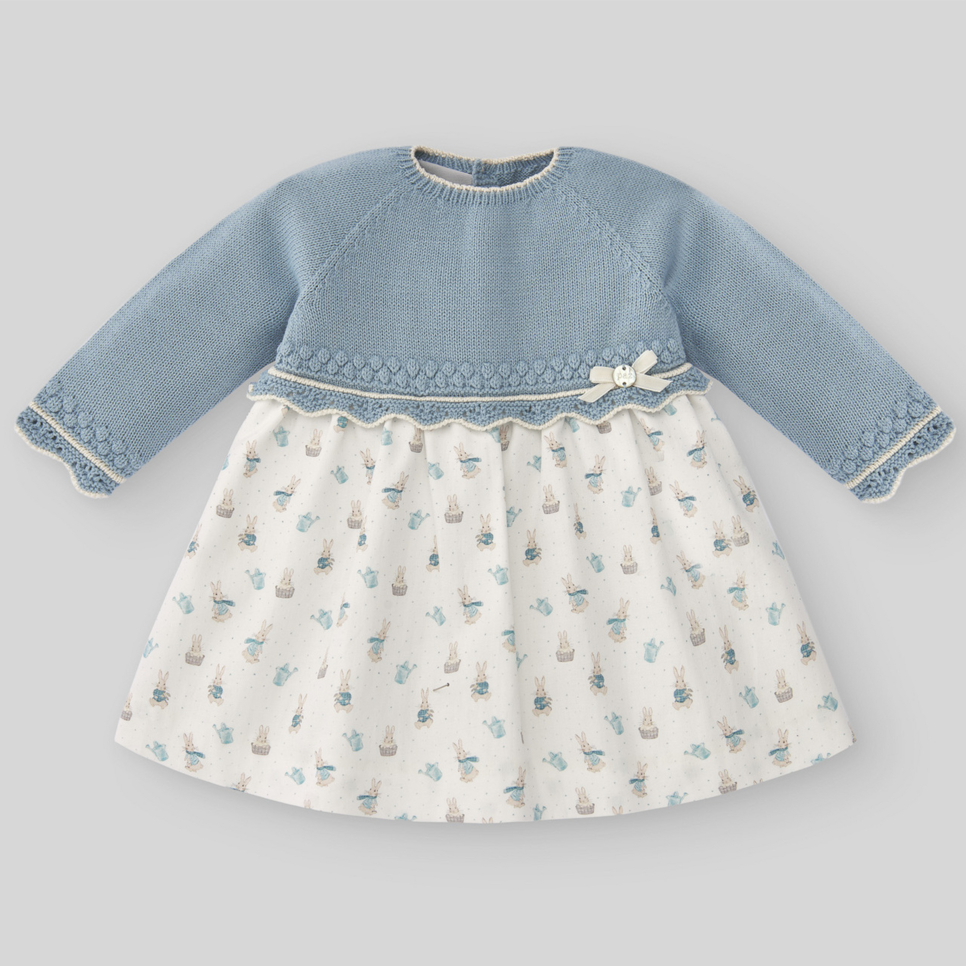 Dress for baby girls, suitable for ages 1 to 48 months or 4 years. Made of cotton fabric with bunny print. Ruffle detail on the front and sleeves. Back closure with buttons